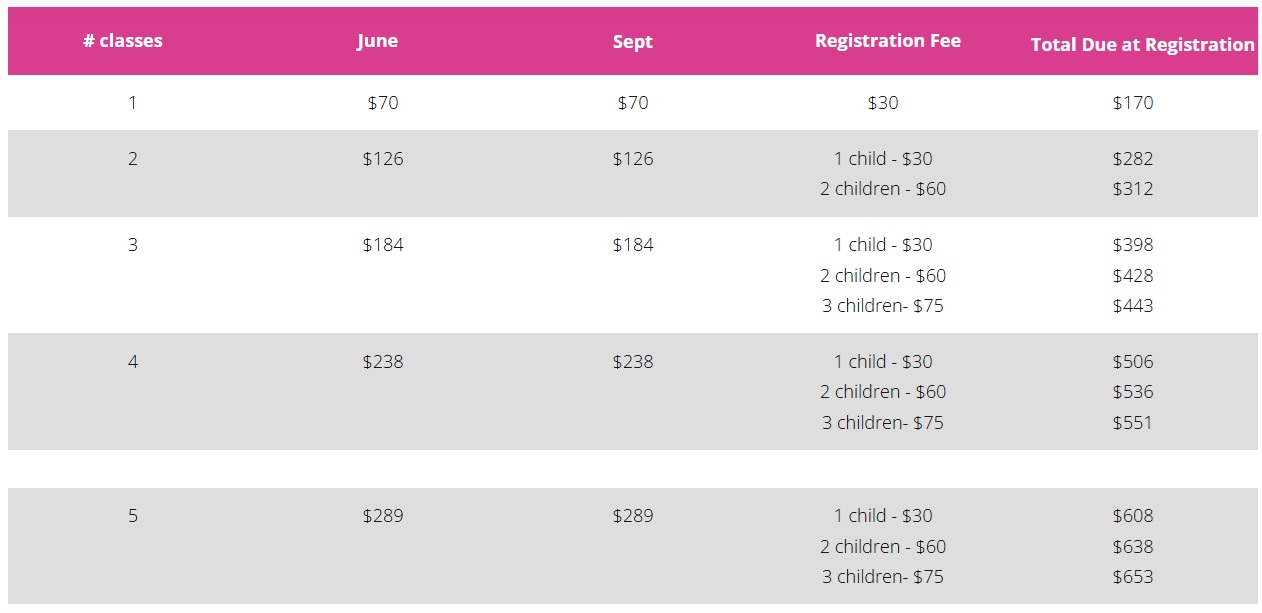 Click here for the Schedule (we are are still working on finalizing Adult Dance / Fitness classes)