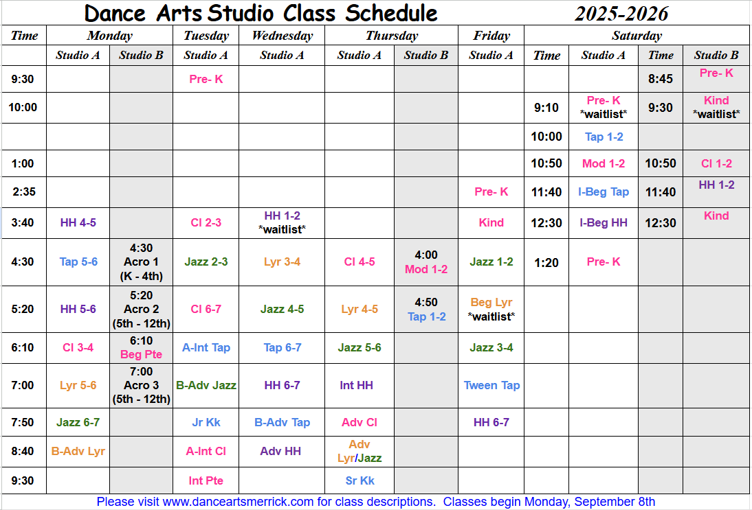 For a description of classes, please visit our Class Details page. Numbers next to class names refer to years of experience in that subject, not age or grade. For example, students in Jazz 2-3 will be in their 2nd or 3rd year of Jazz. If you have any questions regarding class placement, please email [email protected] so we may assist you in selecting the appropriate class.